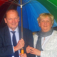 De ambassadeurs Anneke van Etten en Tiemen Meijer onder de kleurrijke paraplu van Als kanker je raakt, het symbool van de stichting.
