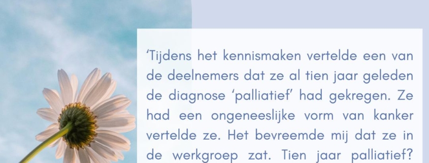 Ik weet het nog goed,mijn eerste bijeenkomst van de werkgroep. Tijdens het kennismaken vertelde een van de deelnemers dat ze al tien jaar geleden de diagnose ‘palliatief’ had gekregen. Ze had een ongeneeslijke vorm van kanker vertelde ze. Het bevreemde mij dat ze in de werkgroep zat. Tien jaar palliatief ? dacht ik.  Als je al zo lang doorleeft, dan lééf je toch gewoon? Anders zou je kunnen zeggen dat iedereen min of meer in zijn of haar  laatste levensfase zit. Want uiteindelijk gaan we allemaal dood, nietwaar.