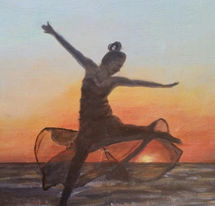 Opeens stond ik voor dit schilderij. Bám. Het raakte mij vol. Het maakte mij emotioneel en veroorzaakte een soort inslag. Ik zag, ik keek, en ik moest spontaan huilen. Ik zag op dit schilderij precies verbeeld hoe ik mijn leven op dat moment ervaarde; dansend in het licht van de ondergaande zon. Dansen in de zon, dat is wat ik altijd heb mogen doen. En opeens leek het of de zon onder ging in mijn leven. Maar ik wilde blijven dansen, ook als de zon aan het ondergaan was. Ik zag de frêle danseres (ik ben niet frêle, maar zo voelde ik mij van binnen wel). De danseres die danst of haar leven er van afhangt. Ze danst in de branding. Het lijkt of ze zweeft. Of ze wordt opgetild misschien. Door een onzichtbare hand. Gods hand? Even heeft ze geen grond onder haar voeten meer. De armen omhoog geheven. Krachtig. De zon is bijna onder, maar ze blijft dansen, dansen, zolang het nog niet helemaal donker is. Zolang het kan.