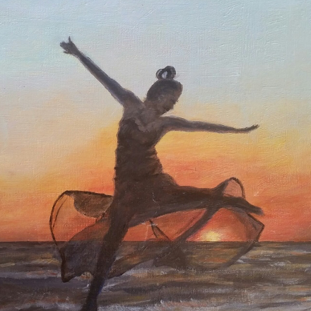 Opeens stond ik voor dit schilderij. Bám. Het raakte mij vol. Het maakte mij emotioneel en veroorzaakte een soort inslag. Ik zag, ik keek, en ik moest spontaan huilen. Ik zag op dit schilderij precies verbeeld hoe ik mijn leven op dat moment ervaarde; dansend in het licht van de ondergaande zon. Dansen in de zon, dat is wat ik altijd heb mogen doen. En opeens leek het of de zon onder ging in mijn leven. Maar ik wilde blijven dansen, ook als de zon aan het ondergaan was. Ik zag de frêle danseres (ik ben niet frêle, maar zo voelde ik mij van binnen wel). De danseres die danst of haar leven er van afhangt. Ze danst in de branding. Het lijkt of ze zweeft. Of ze wordt opgetild misschien. Door een onzichtbare hand. Gods hand? Even heeft ze geen grond onder haar voeten meer. De armen omhoog geheven. Krachtig. De zon is bijna onder, maar ze blijft dansen, dansen, zolang het nog niet helemaal donker is. Zolang het kan.