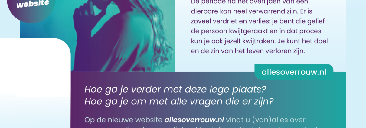 Op de website Allesoverrouw.nl vind je (van)alles over rouw na verlies door overlijden. De website biedt informatie, contactmogelijkheden en professionele hulp vanuit een christelijke identiteit. Voor jezelf of voor een naaste in rouw. Want: rouwen kun je niet alleen!