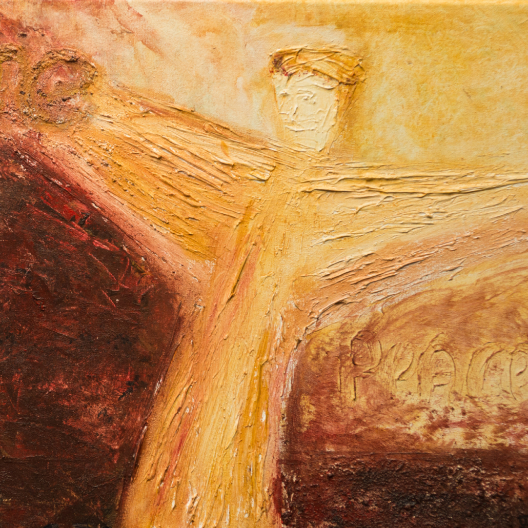Het schilderij “Come” maakte ik in destijds voor kerst. Kerst is immers het begin van Pasen! In de duisternis schijnt een licht. Na een leven waarin Jezus ook ons lijden droeg en aan onze last ten onder ging, is hij opgestaan! Hij kent ons leven, ons lijden van binnenuit en is ons nabij. En belooft: ik maak mijn verlossingswerk af. Dat biedt Hoop.