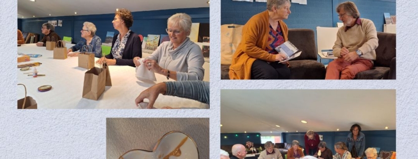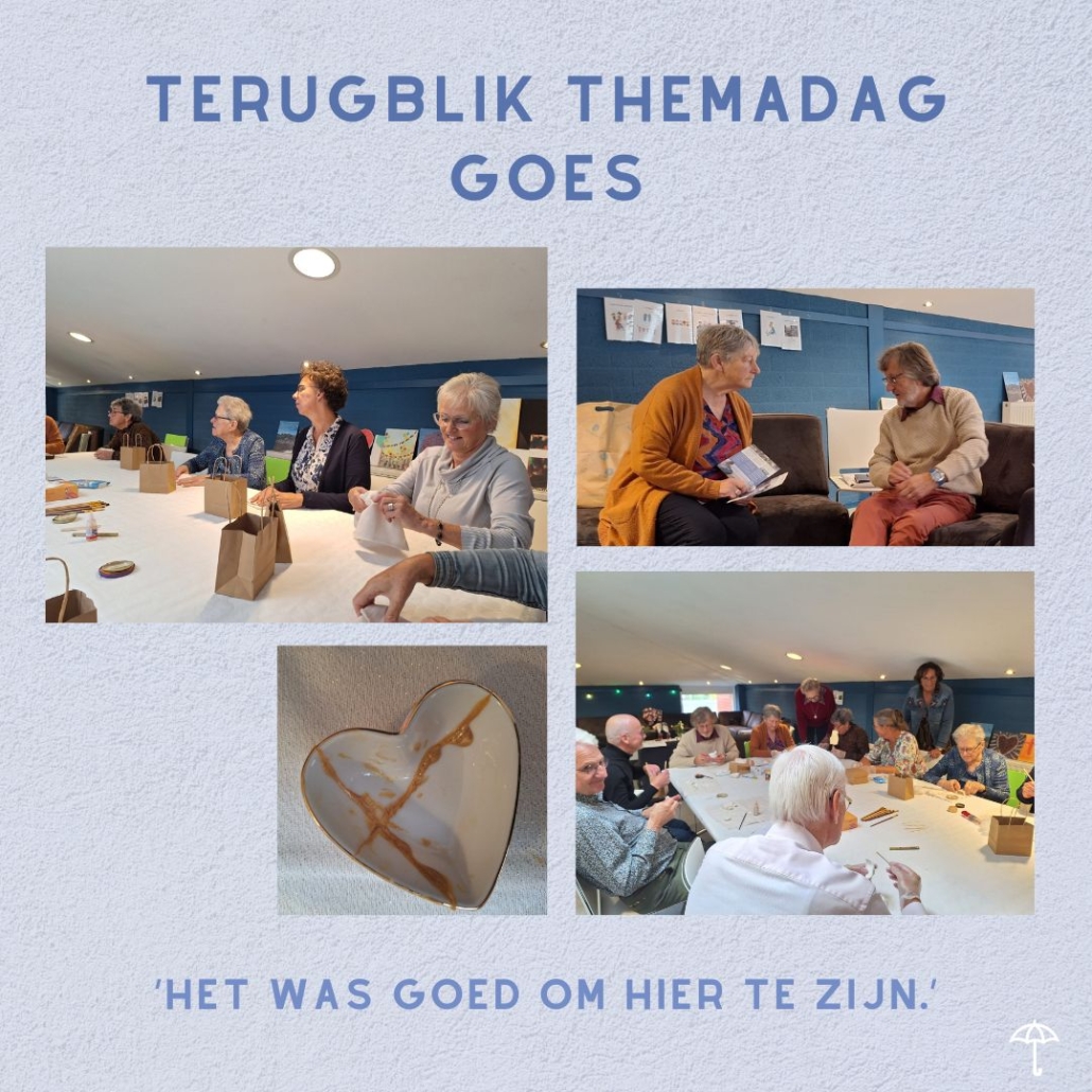 We gaan onder leiding van Tannie een hartjes schaaltje breken en vervolgens met goudlijm lijmen. De gebroken stukken staan symbool voor onze verlieservaringen. Door de stukken aan elkaar te lijmen met goudlijm krijgen we een kunstwerk. Juist door de imperfectie en littekens niet te verbergen, vertellen we hoe een impact het verlies op ons leven heeft. Jouw gebroken hart mag zichtbaar blijven. Er werd druk gewerkt en bij de een lukte het wat beter dan bij de ander maar er kwamen mooie kunstwerken tevoorschijn. We hielden nog een evaluatie rondje waarbij de deelnemers aangaven dat het goed was bij deze themadag aanwezig te zijn geweest.