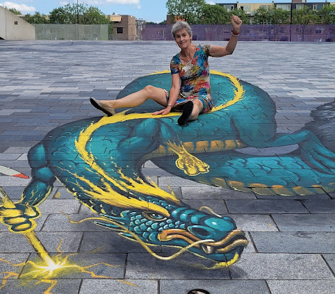 - Privé-afbeelding Christa op draak.Credits to @KerimMusanovic, 3D Streetart Festival Cityplaza Nieuwegein. Nog te bezichtigen tot eind oktober 2023: https://www.cityplaza.nl/Streetart/